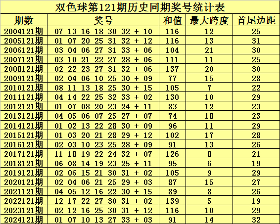 最大跨度推荐:在第121期历史同期开奖中,红球最大跨度全部在5-21之间开出,今年同期注意低位最大跨度出现,参考最大跨度8。