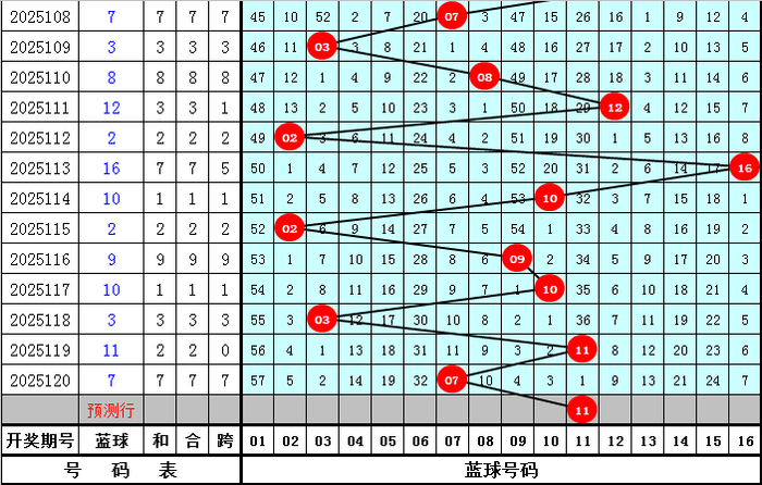 蓝球推荐:第121期历史同期开奖中,蓝球开出频次分别为:01、04、05、08、13、14、16出现0次,10出现1次,03、07、11、15出现2次,02、06、09、12出现3次,今年同期关注蓝球号码11。