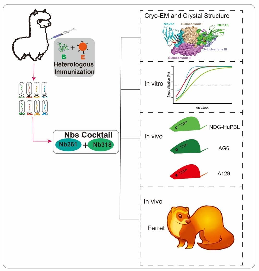此次研究的示意图:从羊驼体内提取纳米抗体,制成“鸡尾酒”,治疗感染“蜱虫病”的小鼠和雪貂。(南京大学供图)早在2016年,南京大学医学院吴稚伟、吴喜林团队就尝试从羊驼体内分离出第一代大别班达病毒纳米抗体,并在小鼠模型上取得初步成果。