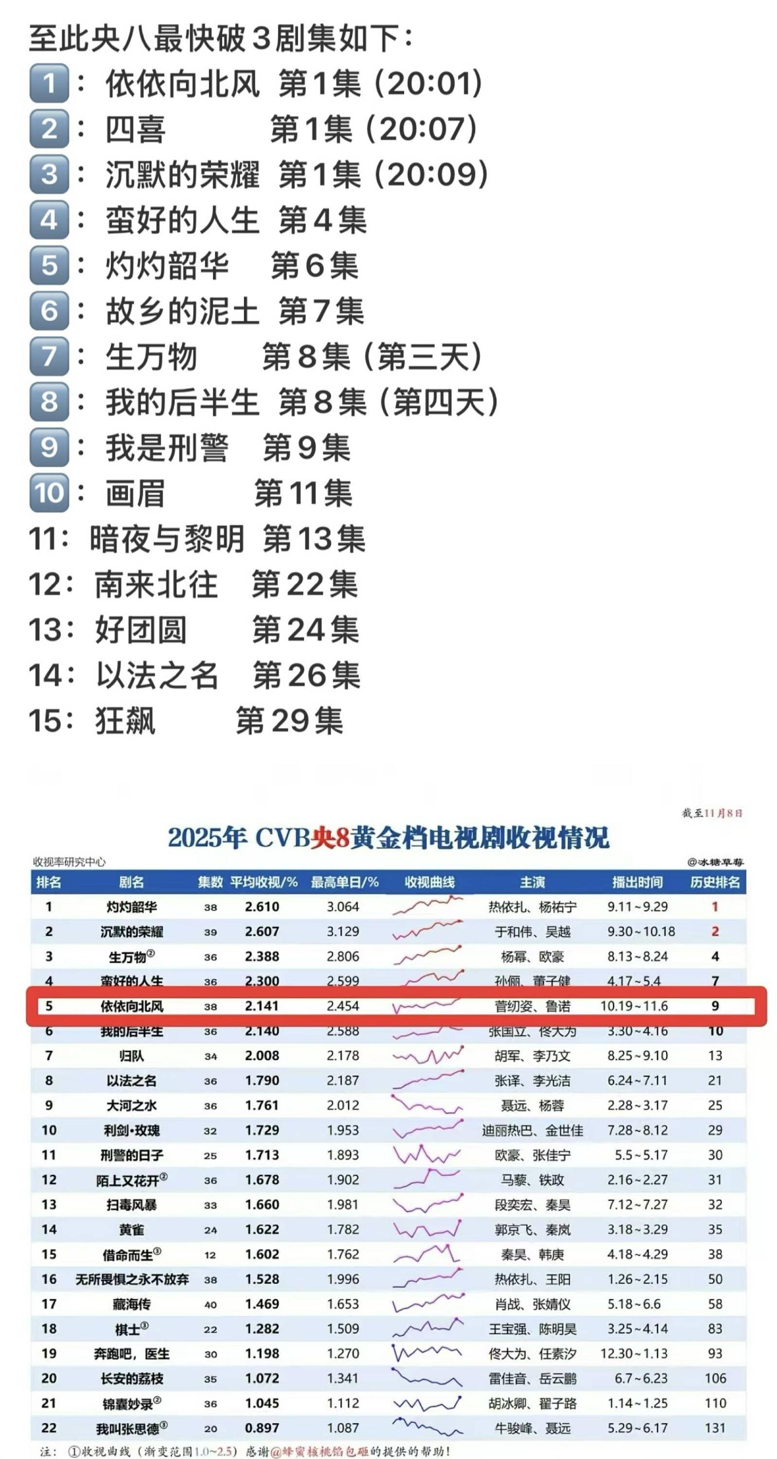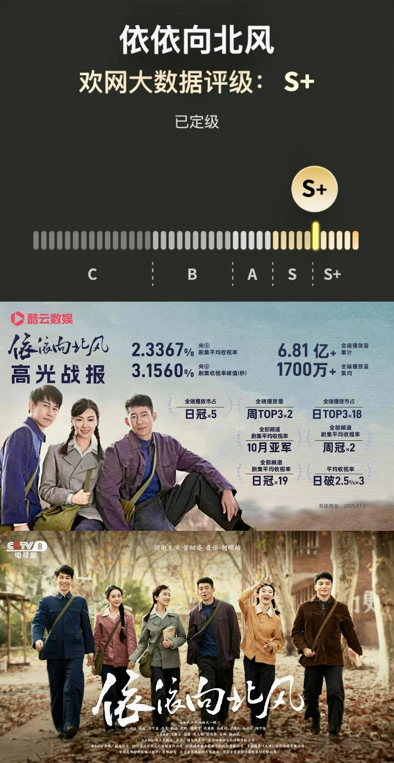 11月6日,电视剧《依依向北风》在CCTV-8黄金档和央视频、爱奇艺等网络平台首轮播出完美收官,取得2025爆款剧集好成绩。首播当日便破记录,成为近几年央视收视率最快破3%电视剧,也是目前央八黄金档最快破3保持者。并在11月4、5、6日播出大结局时,收视率再次连破3%,播出期间更是保持全国收视冠军和居高不下的网络热度,全网全端首轮播放量达到6、81亿,猫眼、欢网大数据定位S+剧集项目,位居央八黄金档CVB收视率全年总排名第五名。