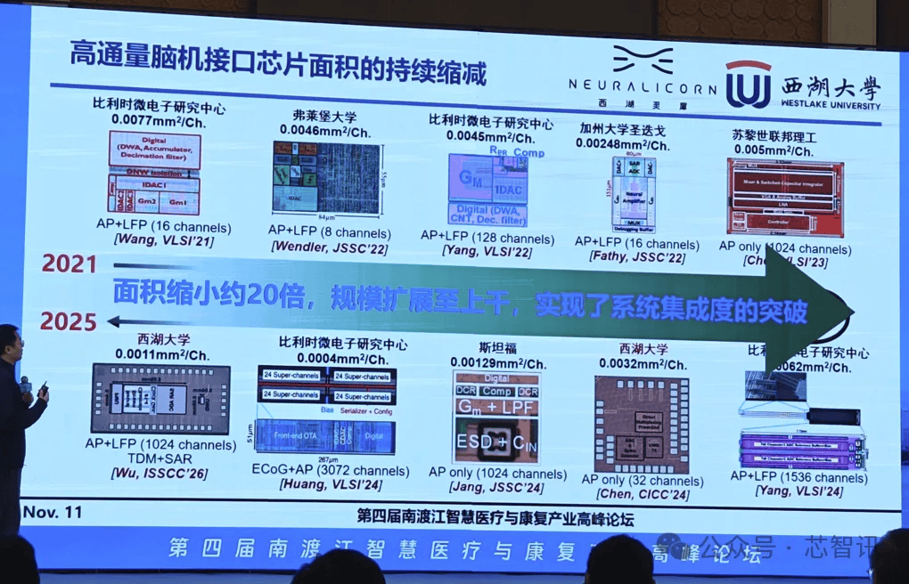从近几年全球高通量脑机接口芯片的小型化发展趋势来看,自2021年的每通道0.0077mm²,到今年西湖大学实现了技术突破,已经做到了每通道0.0011mm²。总体来讲,过去5年的发展中,脑机接口芯片的每通道面积大约缩小20倍,规模扩展至数百个乃至上千个通道,实现了系统集成度的突破。