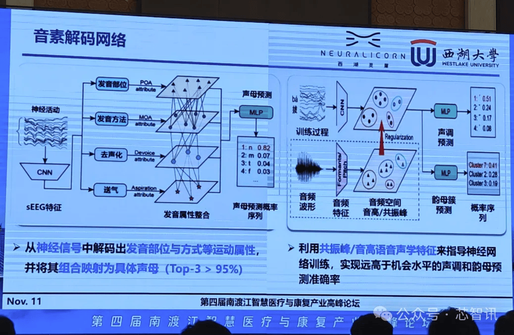 基于上述汉语的脑语言解码机制,西湖灵犀科技开发了针对汉语声母和韵母进行解码的算法网络,可以从脑神经信号中解码出患者发音部位和发音方式相关的属性,再利用该属性进行排列组合,解读出发的是哪个声音。