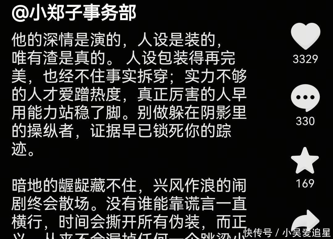 这让网友不得不想起当年胡彦斌和郑爽的半地下恋。恰好郑爽相关账号在胡彦斌恋情曝光后不久,突然发布文字,疑似是内涵胡彦斌是渣男,上来就表示:“他的深情是演的,人设是装的,唯有渣是真的。”