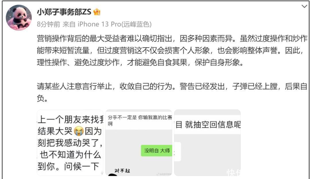 该账号还再度提到,“实力不够的人才爱蹭热度”,喊话别躲在阴影里操纵。此前,郑爽工作室曾晒工作室指责胡彦斌过度炒作,内涵他踩着郑爽把自己营销成“纯爱战神”。如今胡彦斌曝光新恋情,郑爽又被拉出来做比较,怪不得会发文内涵。