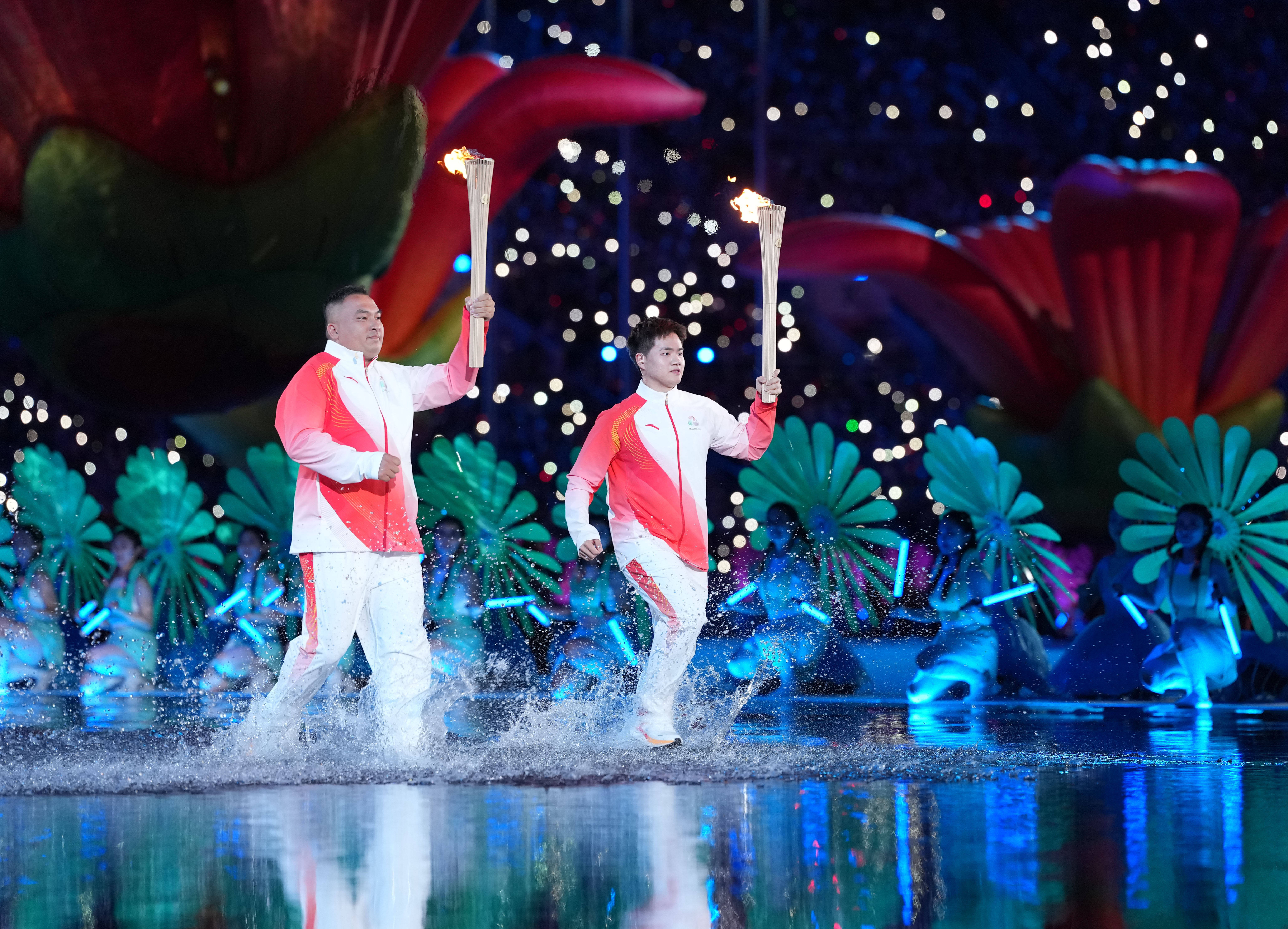 11月9日,火炬手赖宣治(左)、梁伟铿传递火炬。当日,第十五届全国运动会开幕式在广东奥林匹克体育中心举行。新华社记者 吴鲁 摄开幕式前三天