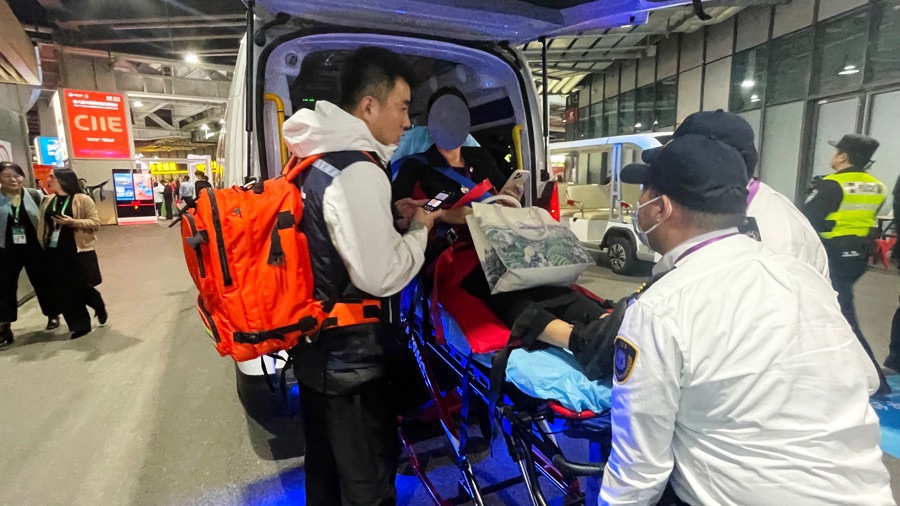 据了解,两人是本届进博会巡场医疗组成员、复旦大学附属闵行医院进博会巡场医疗队队长、急诊科医生冷方杰和护士徐惠凤。他们告诉记者,本届进博会除了固定医疗点外,每片“叶子”每天有22名医护人员,在五大区域含新闻中心及周边商业区域巡场“流动”。